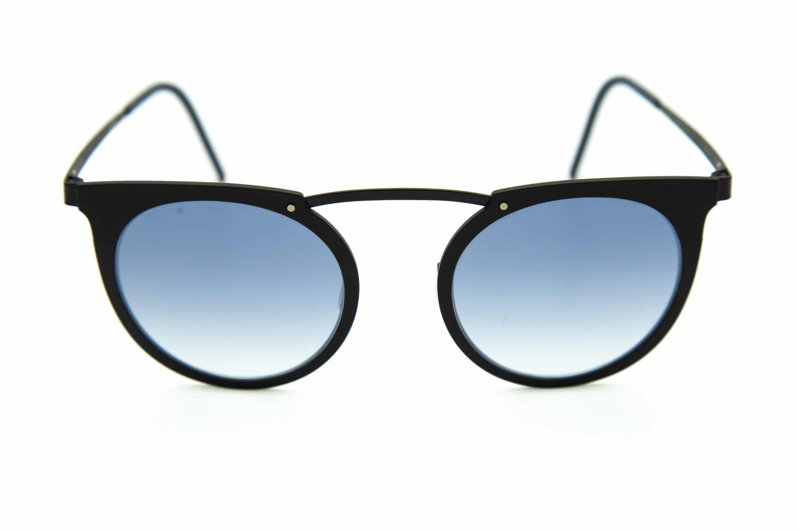 Montatura colore nero opaco Lente colore grigio sfumato specchiata blu