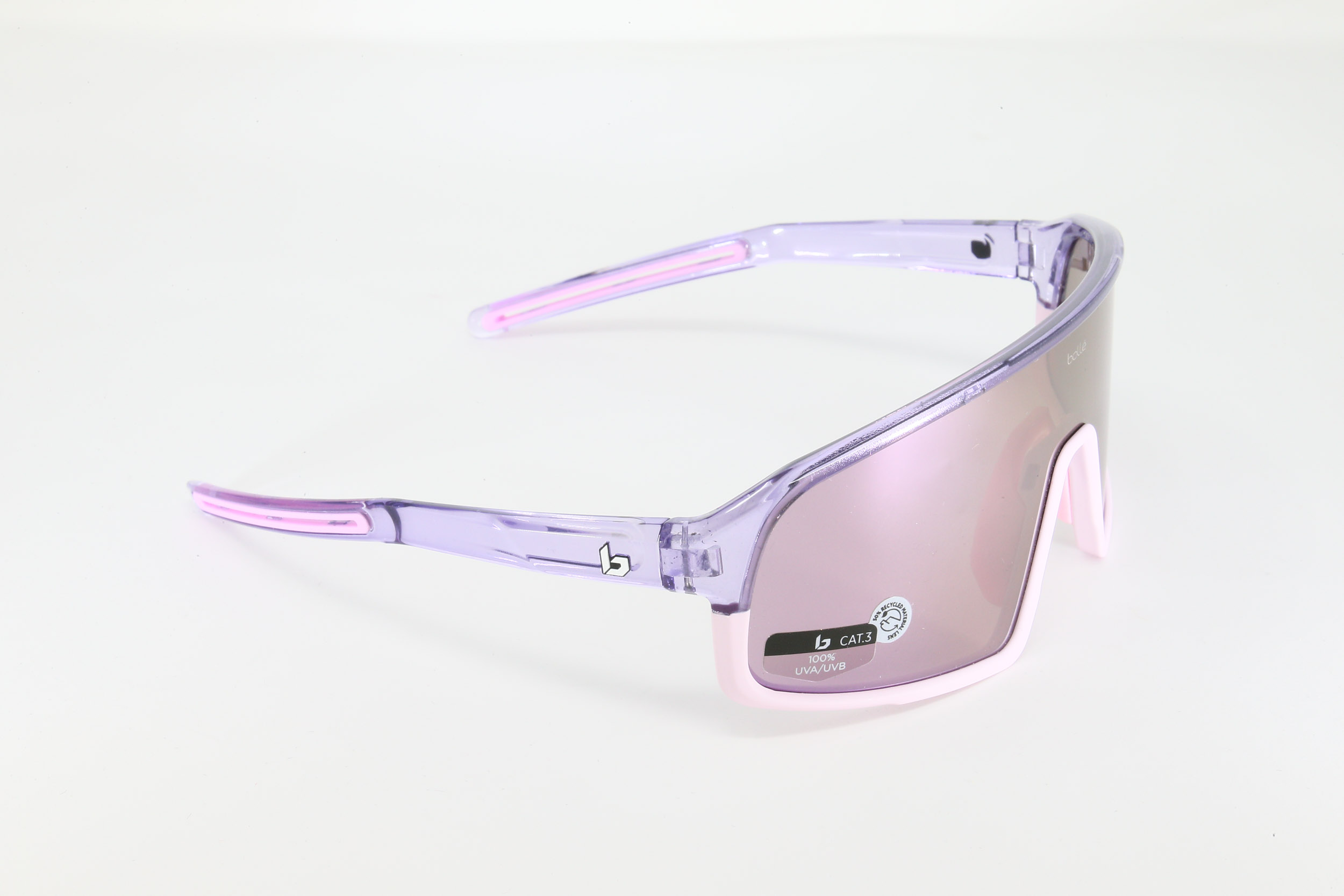 montatura bicolore, viola trasparente e rosa opaco con lentegrigio scuro con specchiatura viola