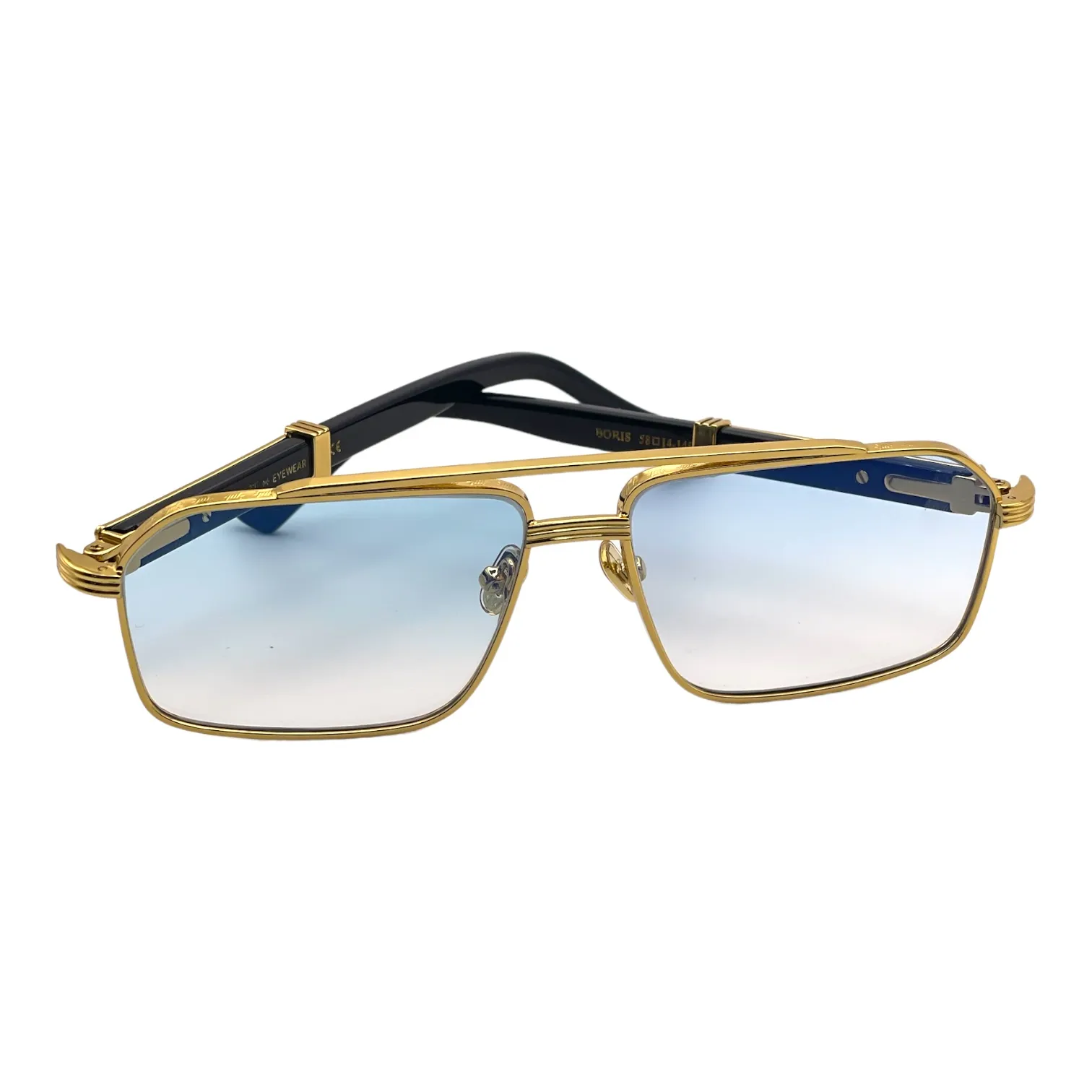 Montatura oro lucido aste nero lente azzurro sfumato