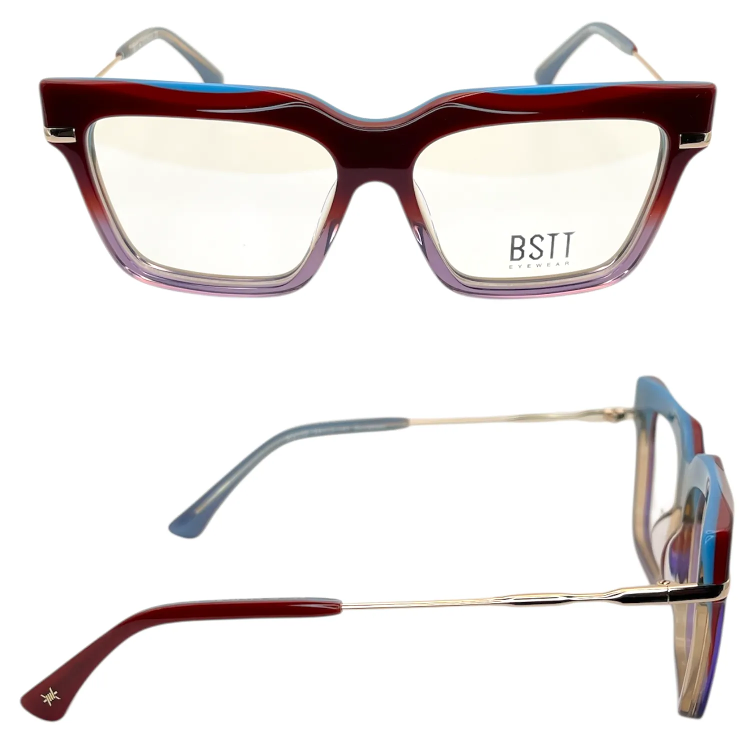 Montatura bordeaux e lilla trasparente interno azzurro e oro