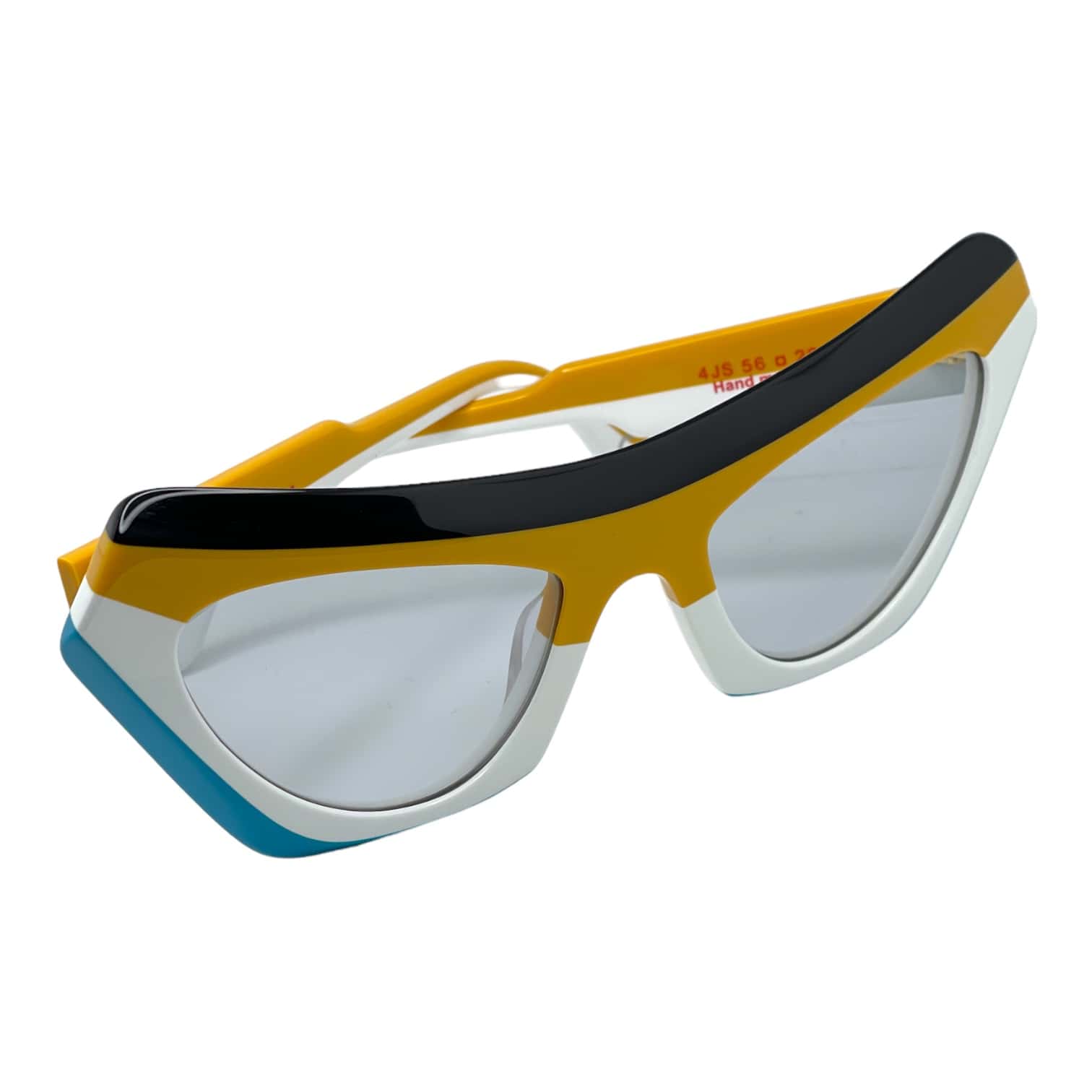 Montatura a strisce giallo nero bianco e azzurro lente azzurro chiaro