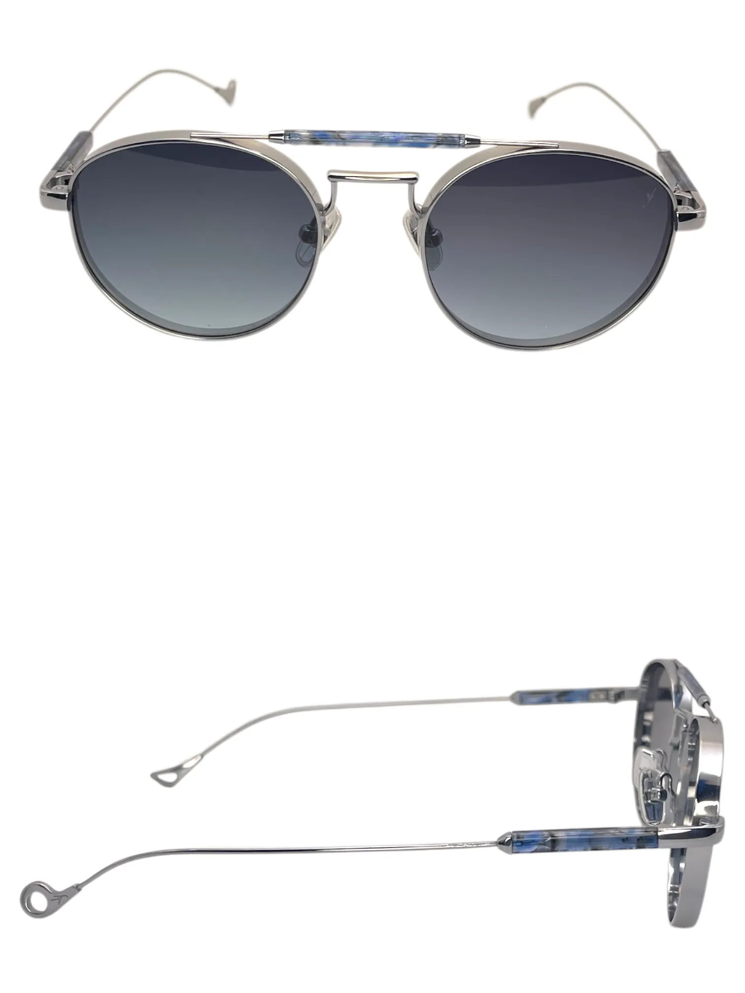 Montatura argento inserti screziato azzurro lente grigio blu sfumato