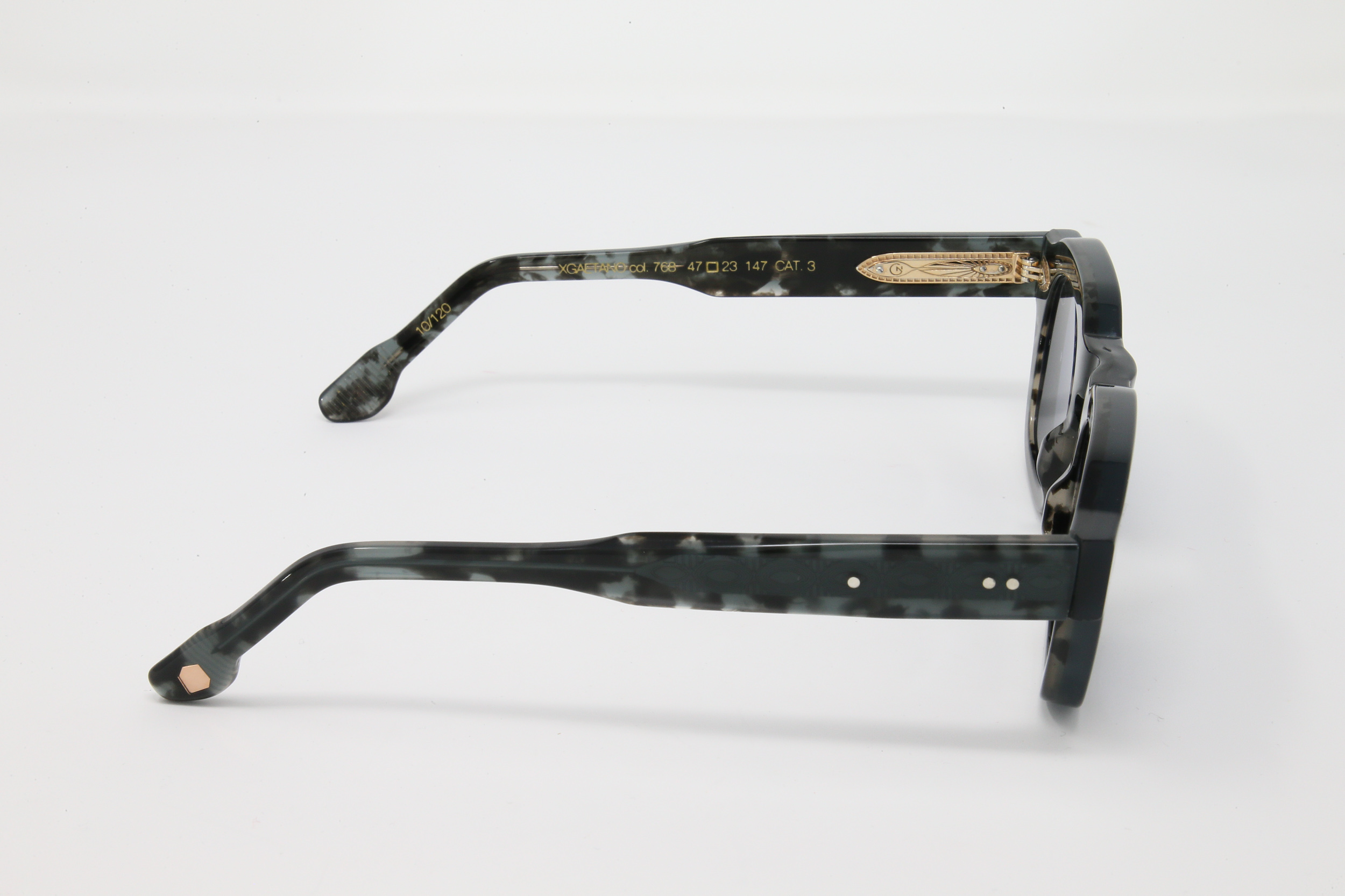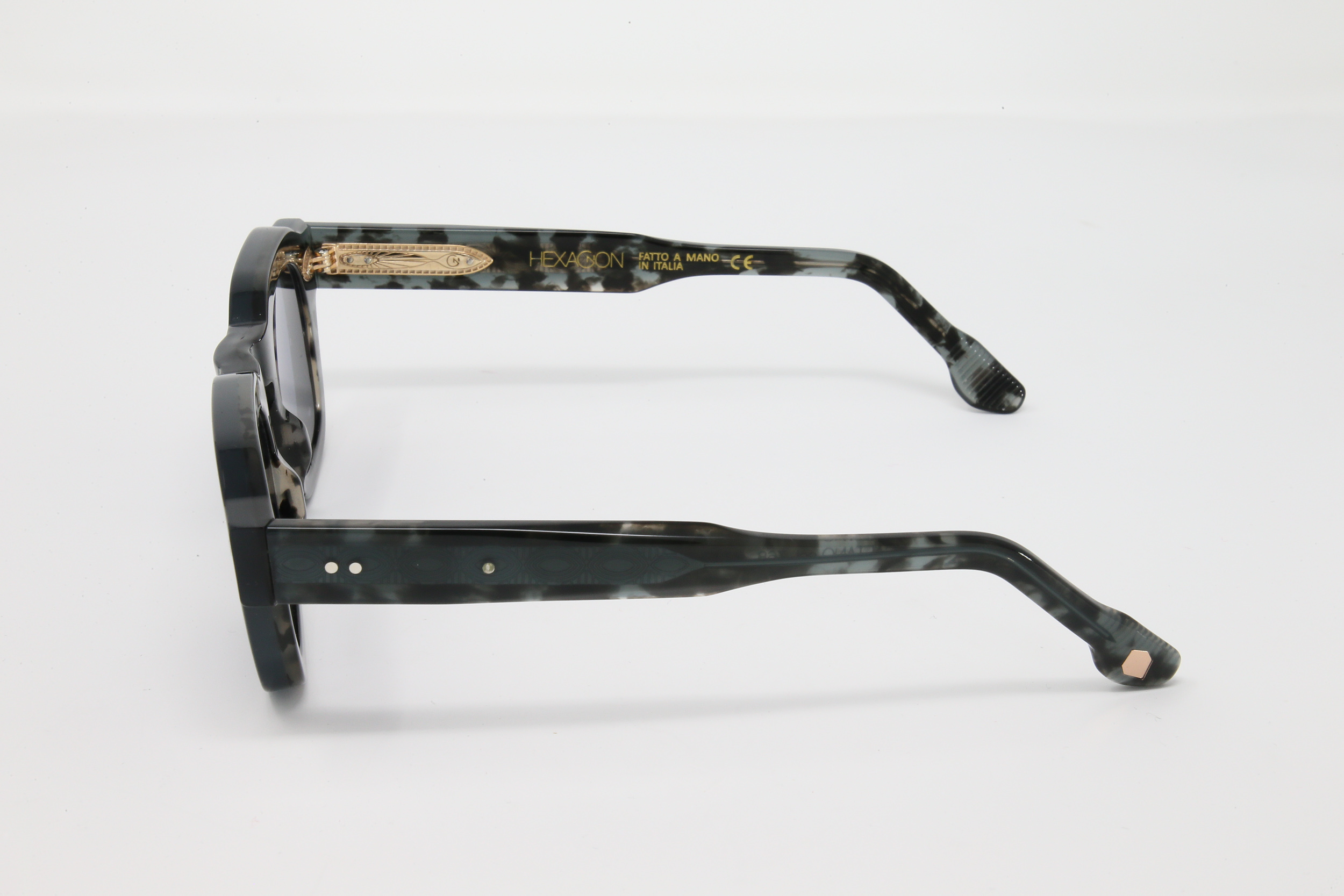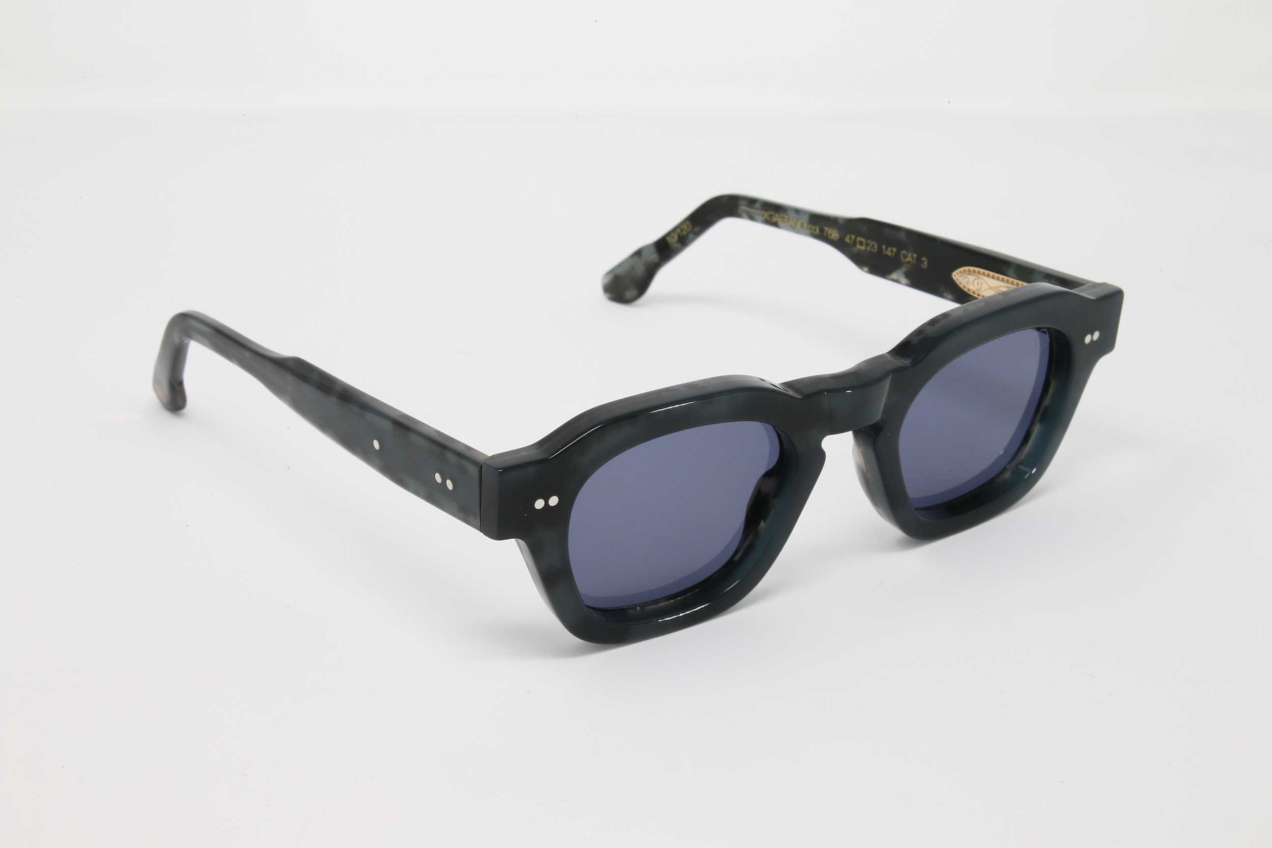 montatura in acetato spessorato doppia lastra: esterno colore tartarugato blu scuro, interno tartarugato salepepe con lente grigioblu scuro CAT:3