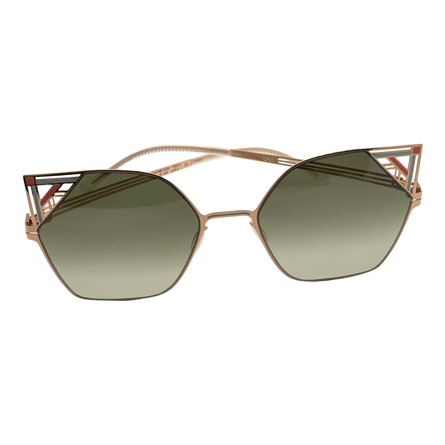 Montatura oro rosa inserti rosa e azzurro lente verde sfumato