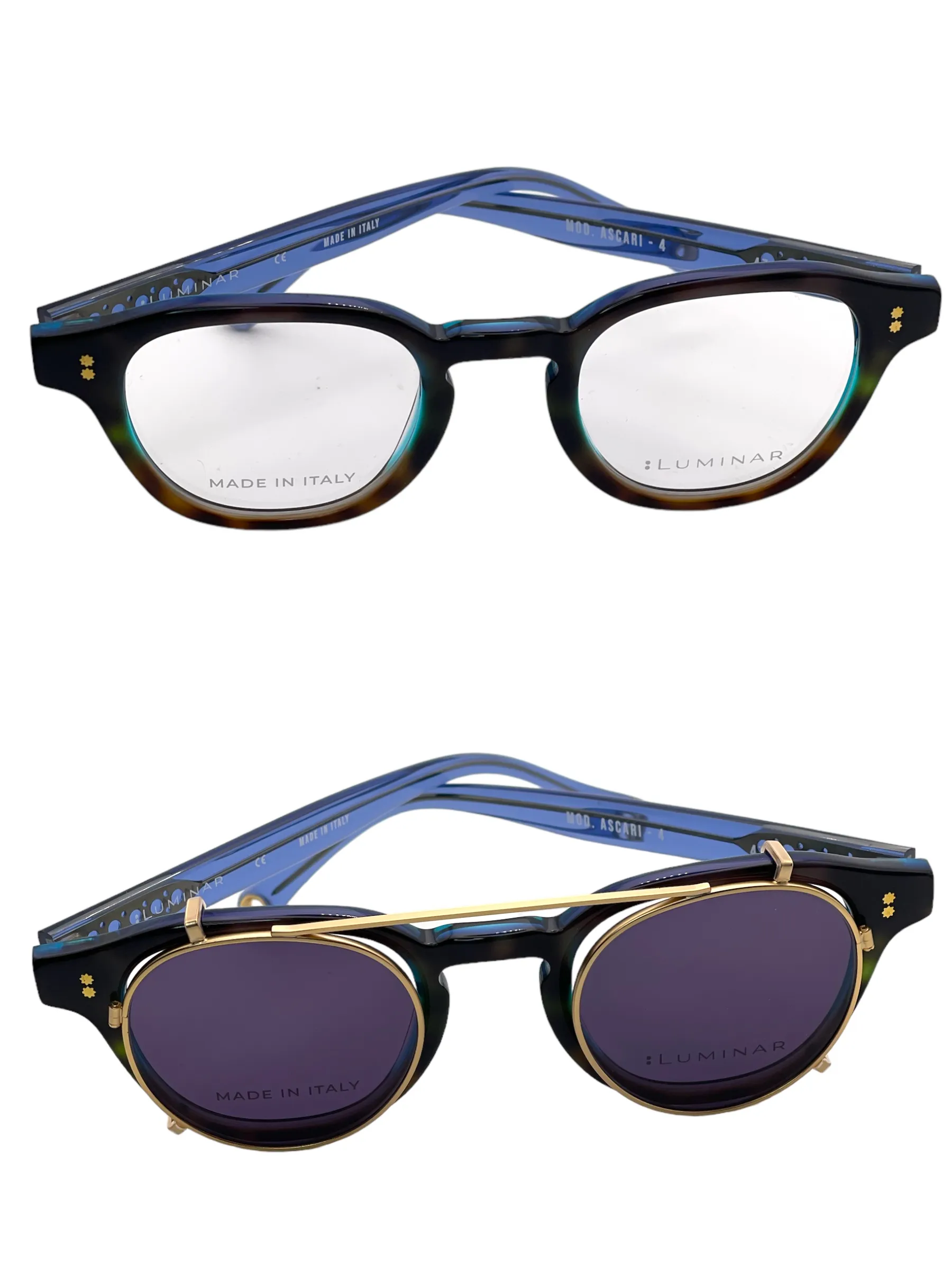 Montatura frontale nero verde aste blu trasparente con clip oro lente blu scuro