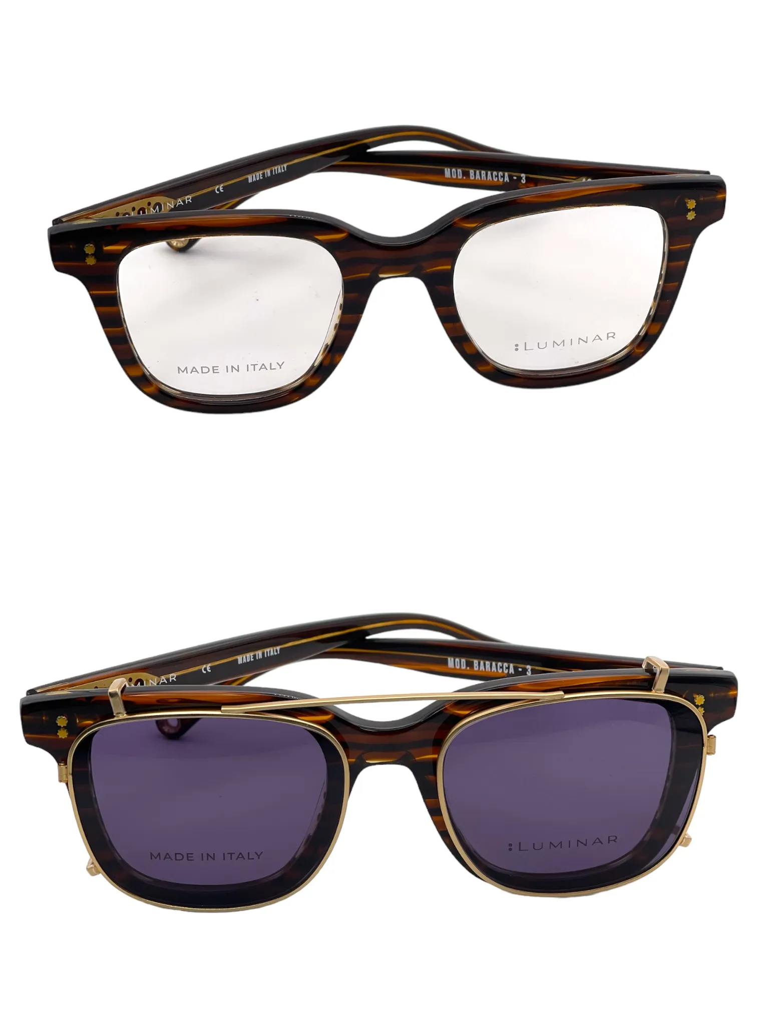 Montatura striato marrone lucido con clip oro lente blu scuro