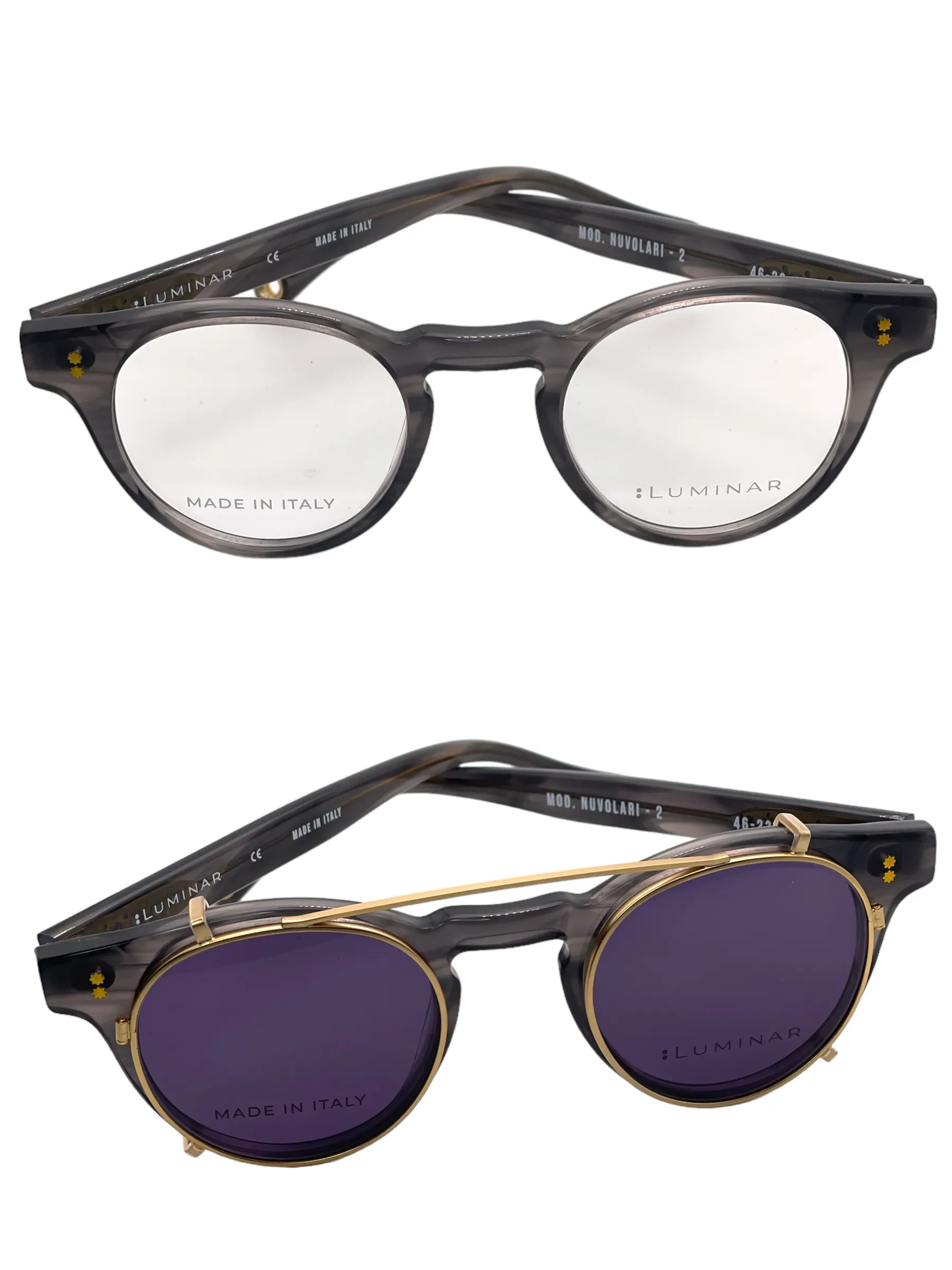 Montatura striato grigio trasparente con clip oro lente blu scuro