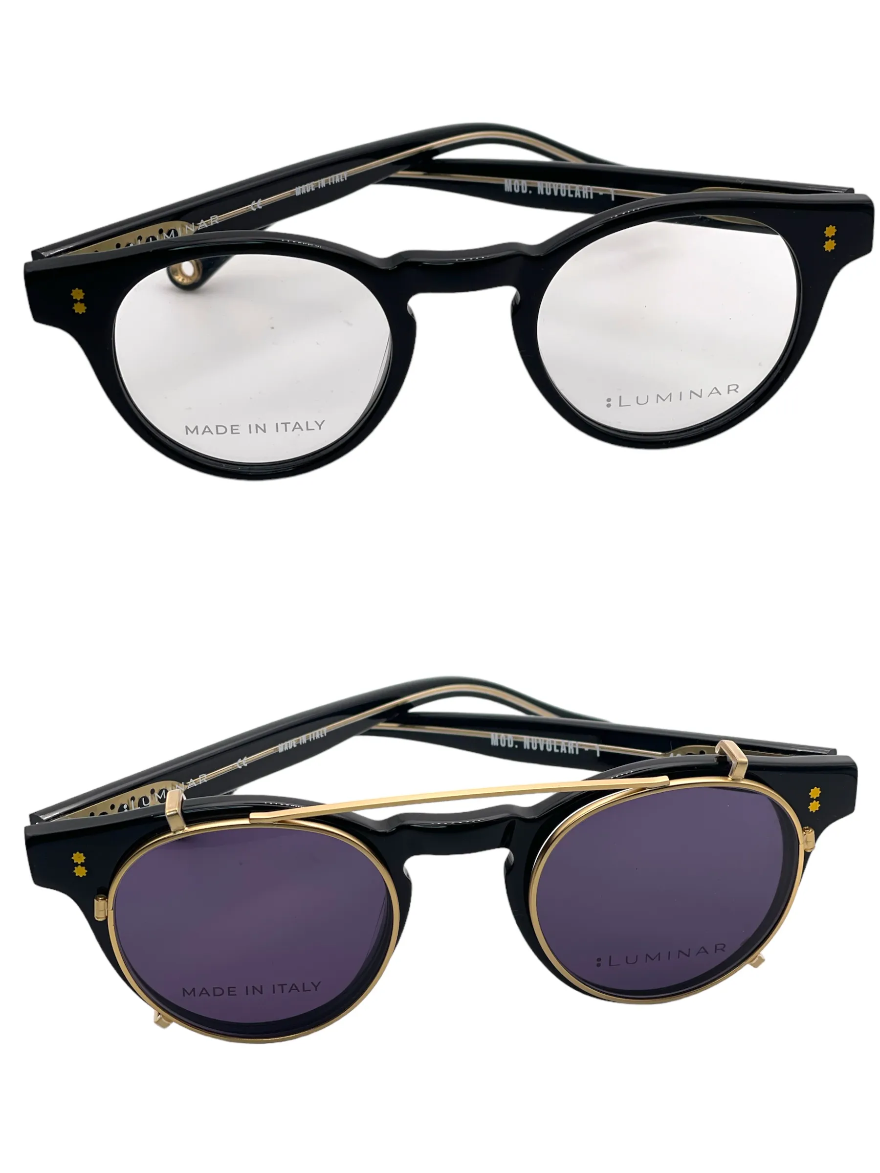 Montatura nero lucido con clip oro lente blu scuro