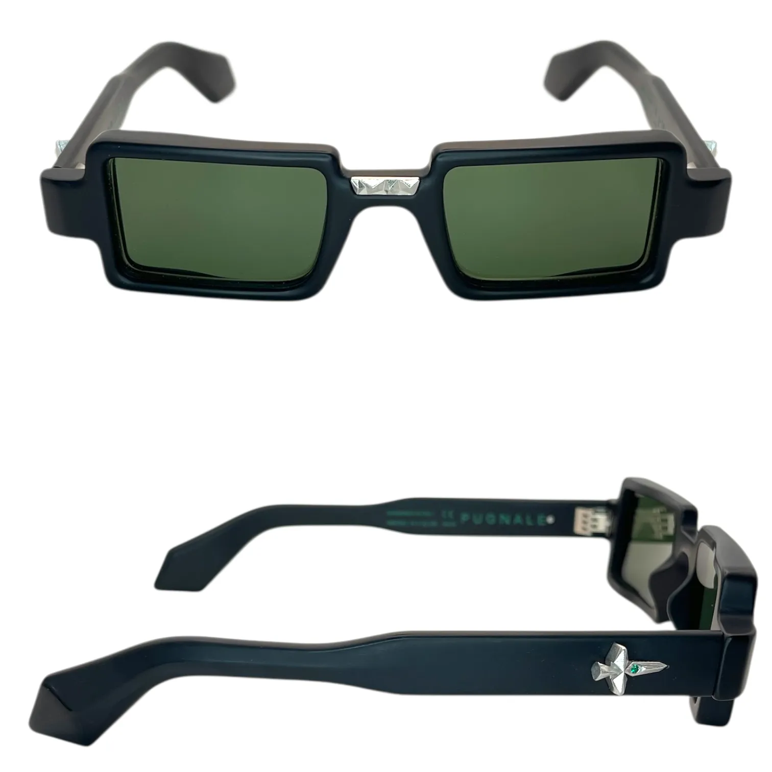 Montatura nero opaco lente verde scuro inserti in argento con Smeraldi taglio tondo