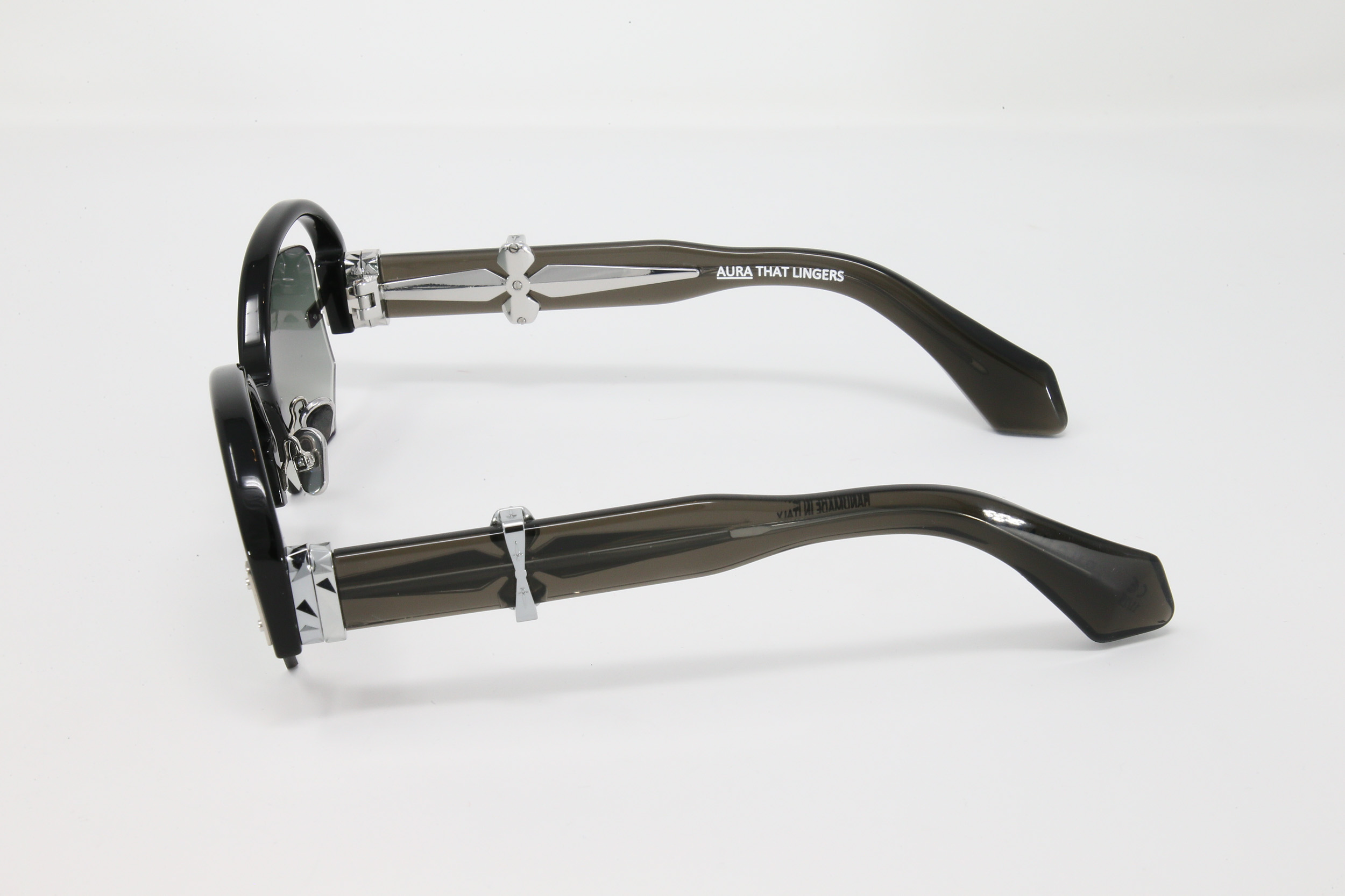 Montatura glasant con frontale nero lucido, aste nero trasparente e lente grigio sfumato con antiriflesso interno