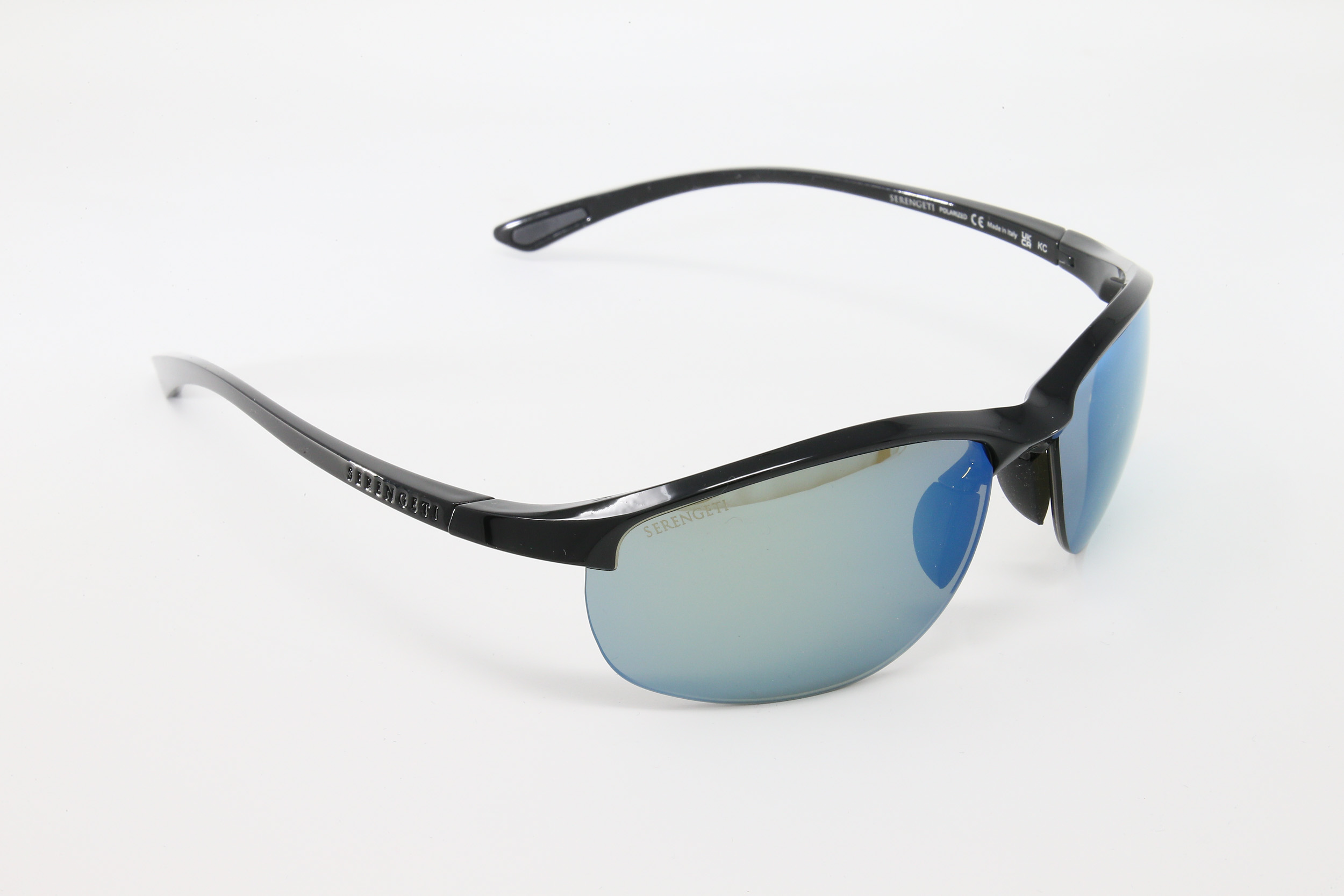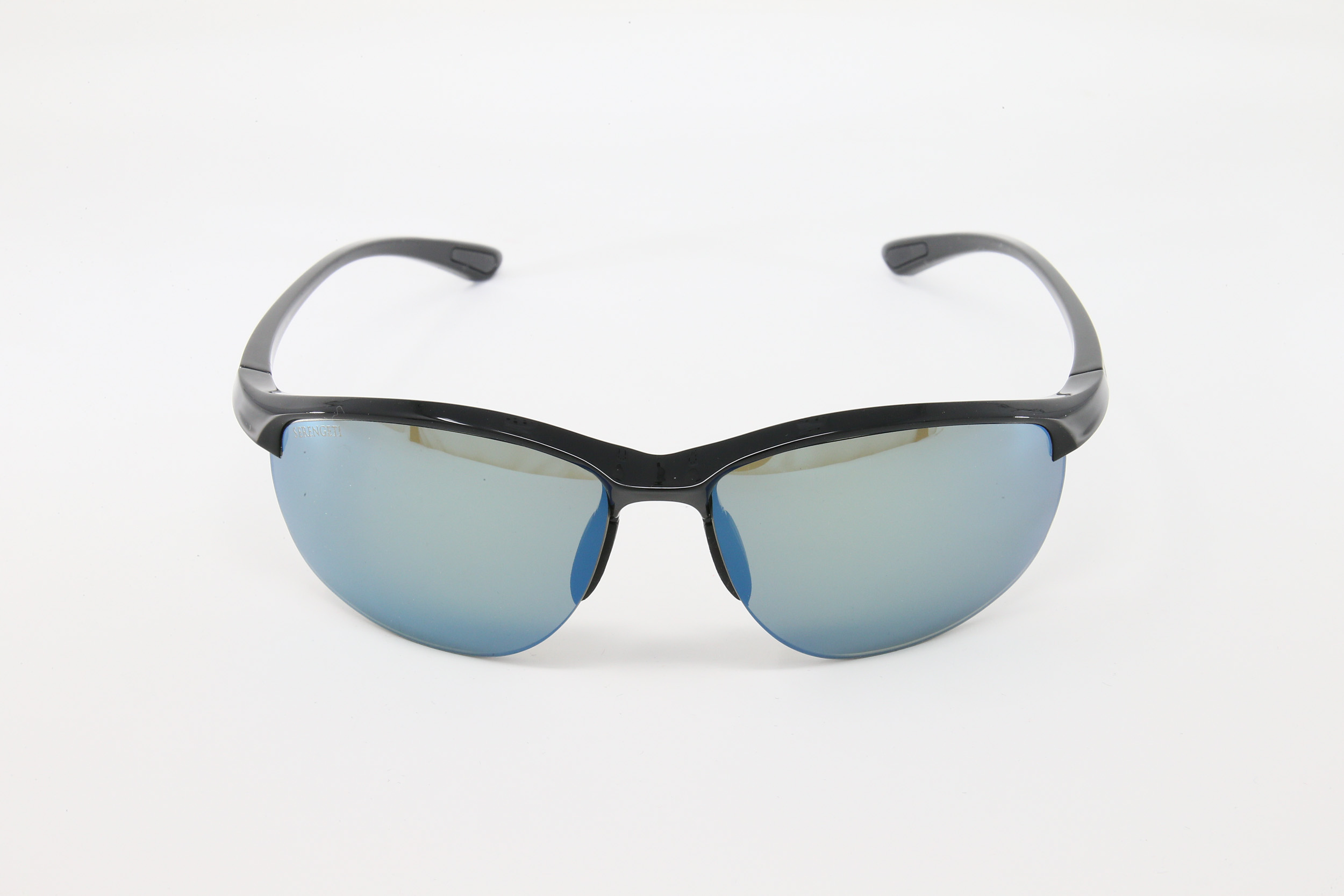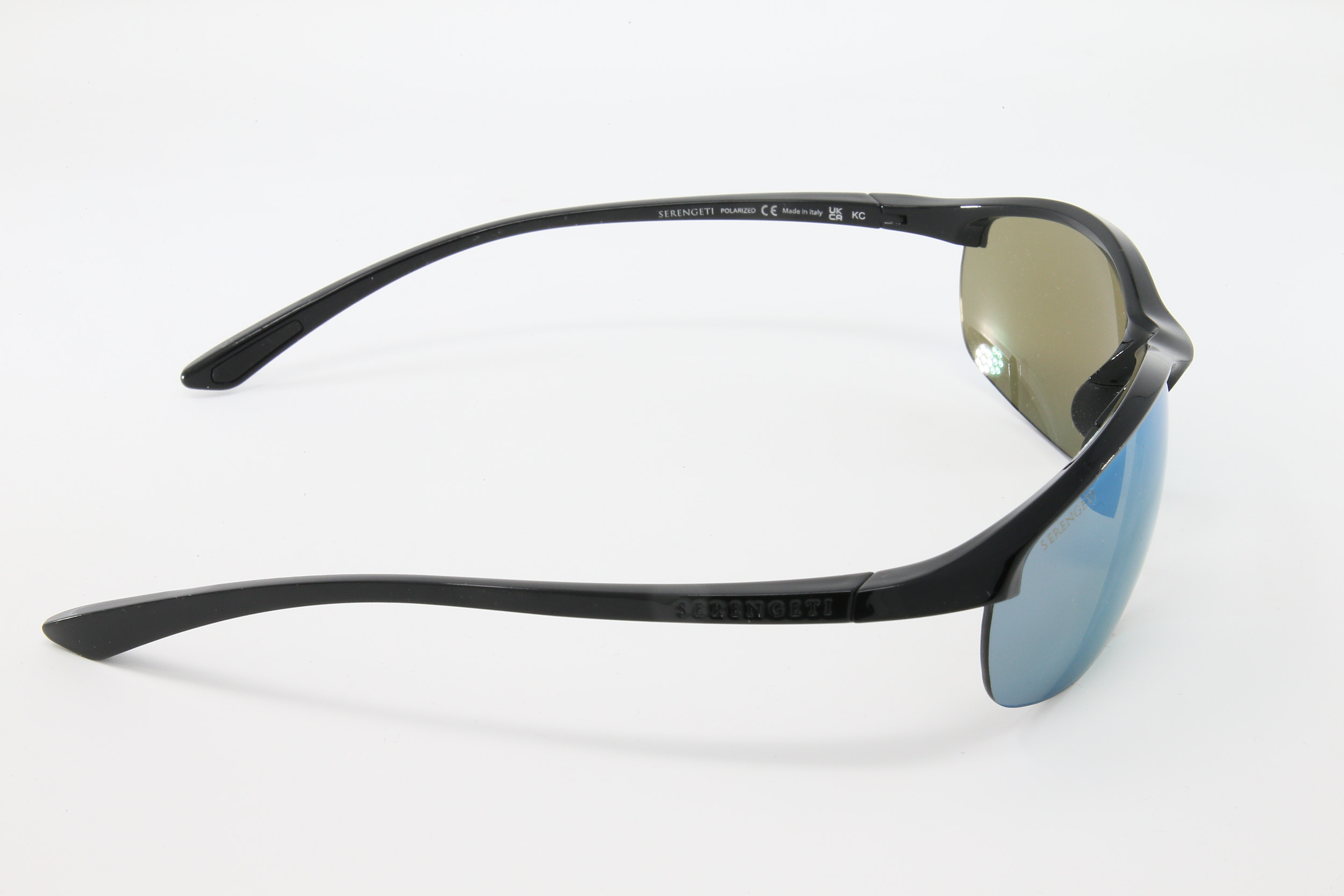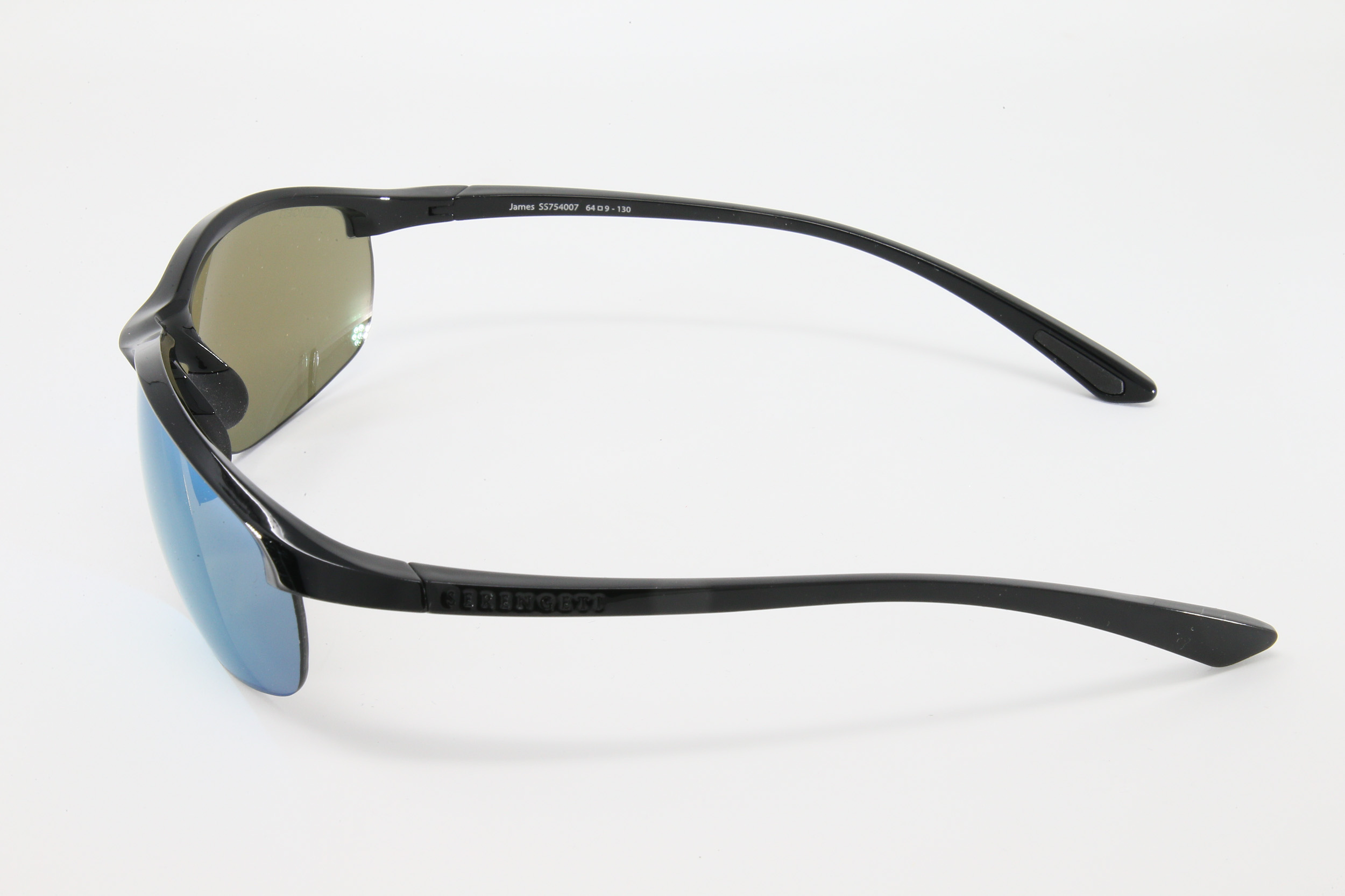 montatura colore nero lucido con lente grigioverde flashata blu, antiriflesso interno e polarizzata